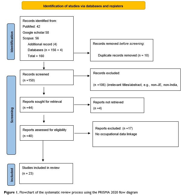 A total of 156 records were initially identified across the three databases. After removal of 10 duplicate records, 146 studies remained for title and abstract screening. Study selection and screenings were conducted independently by two reviewers. Discrepancies were resolved through discussion and consensus. Of the 146 records screened, 106 were excluded based on irrelevance (e.g., non-JE focus, non-India setting, or absence of occupational/environmental exposure data). A total of 40 full-text articles were assessed for eligibility, of which 4 could not be retrieved. Of the remaining 36 articles, 17 were excluded due to lack of occupational data linkage. Ultimately, 23 studies met all inclusion criteria and were included in the final review. The study selection process is illustrated in Figure 1.