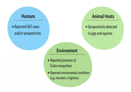 | Baruah et al., (2018) | Assam (Northeast India) | Entomological / Zoonotic study | 997 Mosquitoes, 335 Pigs | Strong seasonal correlation found between mosquito abundance, pig seropositivity (22.99%), and human cases. [2] |