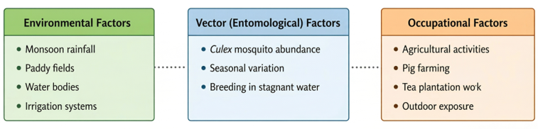 The findings indicate that JE is not only a vector-borne disease but also an occupationally mediated health risk in endemic agricultural settings. The review identified agricultural workers, pig-rearing households, and tea plantation workers, highlighting the role of occupational exposure to JE transmission. These populations are routinely exposed to environments that support mosquito breeding, including paddy fields, stagnant water bodies, and livestock shelters (Borah et al., 2013; Baruah et al., 2018). The overlap of occupational activities with peak vector density periods, particularly during the monsoon season, appears to play a central role in shaping exposure patterns (Walsh et al., 2022). This is consistent with previous evidence highlighting the importance of environmental and occupational interfaces in JE transmission (Kakkar et al., 2017). This shift towards an increasing adult disease burden is further supported by large-scale surveillance data from Uttar Pradesh (Verma et al., 2025), supporting the role of occupational exposure in shaping current epidemiological patterns