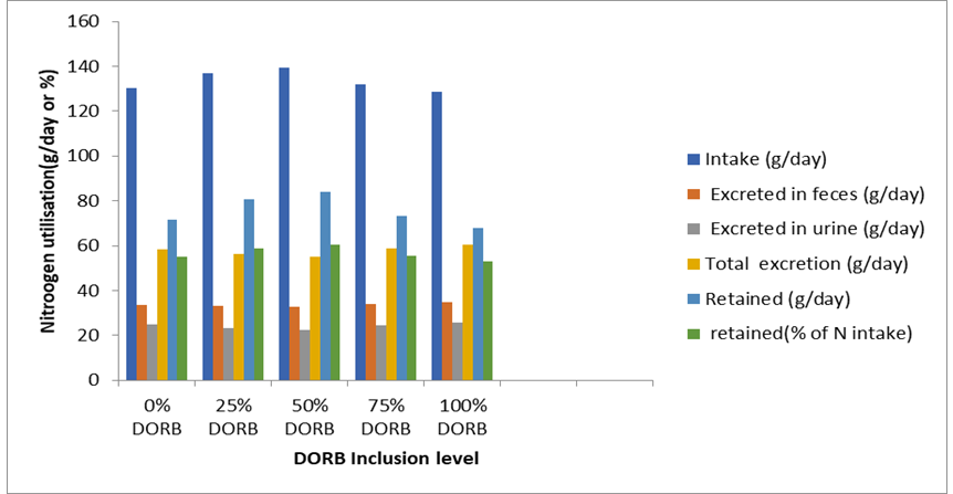 Nitrogen metabolism also responded positively to moderate DORB inclusion. Bulls fed 25% and 50% DORB had significantly higher nitrogen intake and retention, corresponding with improved CP digestibility and nutrient absorption. This mirrors findings by Azevêdo et al. (2011) and Bishwass et al. (2023), who found better nitrogen balance in cattle and sheep when DORB partially replaced WB due to improved rumen degradability and post-ruminal absorption. Reduced urinary nitrogen excretion in these groups suggests more efficient protein utilization, with nitrogen being channeled into tissue synthesis rather than excretion. This is a hallmark of efficient rumen fermentation and microbial protein synthesis, as discussed by Rodríguez et al. (2007) and Rosmalia et al. (2022). Higher nitrogen retention as a percentage of intake further suggests that DORB protein, when fed at moderate levels, is of high biological value and well-aligned with animal metabolic demands. Conversely, nitrogen retention dropped at 75% and 100% DORB inclusion, likely due to reduced digestibility and imbalanced energy-to-protein ratios. Anti-nutritional factors like phytates may have interfered with nitrogen assimilation (Ries et al., 2020), while excessive dietary fibre could have hindered rumen fermentation and nutrient absorption, as noted by Semwogerere et al. (2024). These outcomes stress the importance of limiting DORB inclusion to 50% or less to support efficient nitrogen metabolism.